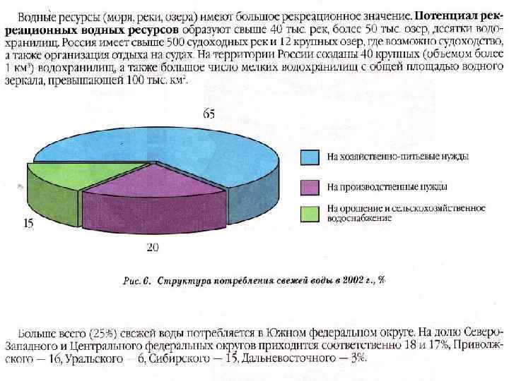 По ресурсам речного стока Россия занимает 2 е место в мире после Бразилии с её многоводной р. Амазонка, но в расчёте на единицу площади (237 мм) уступает среднему мировому показателю (294 мм). Ресурсами наиболее ценного для водного хозяйства подземного стока и почвенной влаги (валовое увлажнение территории) наша страна обеспечена в 2 раза меньше среднего мирового уровня. В пересчёте же на одного жителя обеспеченность ресурсами подземного стока, почвенной влагой и особенно полным речным стоком (28 тыс. м 3/год) более чем в 4 раза превосходит среднюю мировую. Экономическая оценка, водных ресурсов.