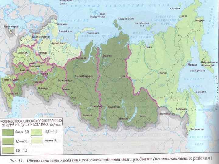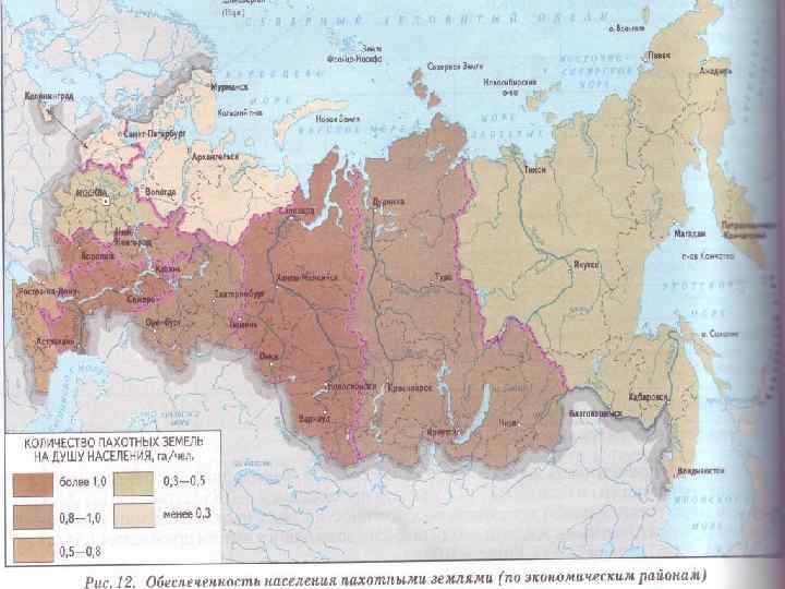Земельные ресурсы Общий земельный фонд РФ составляет 1709, 8 млн га (1 место в мире) при средней плотности населения 83 чел. /тыс. га. Средняя обеспеченность одного жителя РФ сельхоз. угодьями составляет 1, 5 га, в т. ч. пашней 0, 85 га. (США 0, 67, Индия 0, 17, Китай 0, 08 га). По размерам пашни (119 млн. га) Россия занимает 3 место в мире (после США и Индии). Освоенность земель РФ (по данным ФАО) всего 20%.