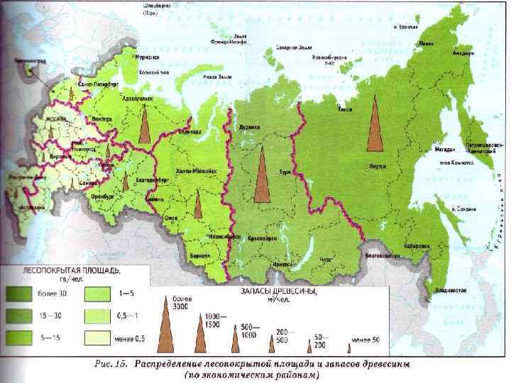 Лесные ресурсы По площади лесов (1/5 мирового лесного фонда) как и по запасам древесины РФ занимает 1 место в мире. По среднестатистическому показателю на одного жителя лесопокрытой площади (5 га) и запасов древесины (512 куб. м) РФ уступает только Канаде. Продуктивность лесов России как показатель среднегодового прироста древесины на 1 га лесопокрытой площади составляет в среднем 1, 2 м 3. (в США 3, 1).
