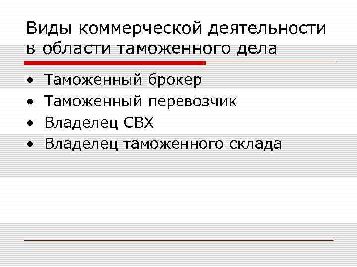 Виды коммерческой деятельности в области таможенного дела • Таможенный брокер • Таможенный перевозчик • Владелец СВХ • Владелец таможенного склада