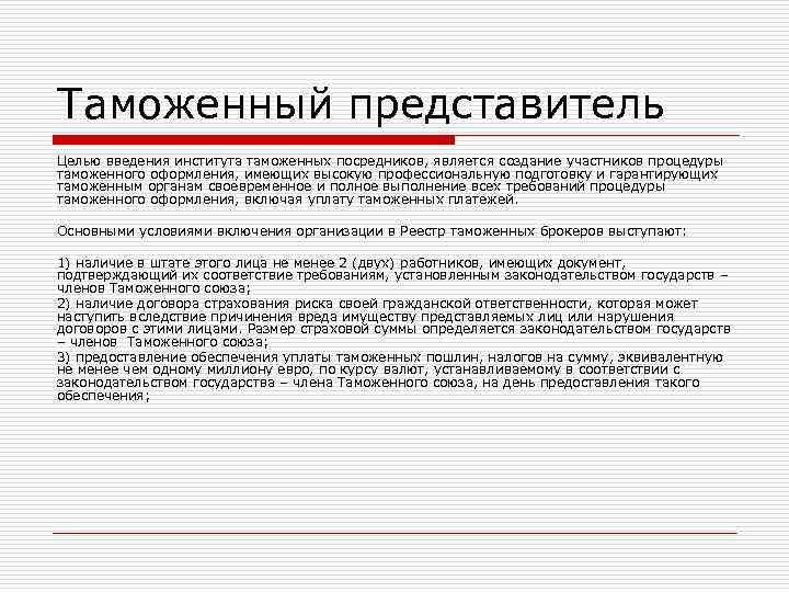 Таможенный представитель Целью введения института таможенных посредников, является создание участников процедуры таможенного оформления, имеющих высокую профессиональную подготовку и гарантирующих таможенным органам своевременное и полное выполнение всех требований процедуры таможенного оформления, включая уплату таможенных платежей. Основными условиями включения организации в Реестр таможенных брокеров выступают: 1) наличие в штате этого лица не менее 2 (двух) работников, имеющих документ, подтверждающий их соответствие требованиям, установленным законодательством государств – членов Таможенного союза; 2) наличие договора страхования риска своей гражданской ответственности, которая может наступить вследствие причинения вреда имуществу представляемых лиц или нарушения договоров с этими лицами. Размер страховой суммы определяется законодательством государств – членов Таможенного союза; 3) предоставление обеспечения уплаты таможенных пошлин, налогов на сумму, эквивалентную не менее чем одному миллиону евро, по курсу валют, устанавливаемому в соответствии с законодательством государства – члена Таможенного союза, на день предоставления такого обеспечения;