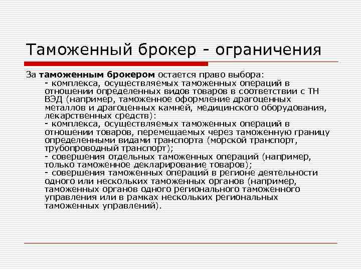 Таможенный брокер - ограничения За таможенным брокером остается право выбора: - комплекса, осуществляемых таможенных операций в отношении определенных видов товаров в соответствии с ТН ВЭД (например, таможенное оформление драгоценных металлов и драгоценных камней, медицинского оборудования, лекарственных средств): - комплекса, осуществляемых таможенных операций в отношении товаров, перемещаемых через таможенную границу определенными видами транспорта (морской транспорт, трубопроводный транспорт); - совершения отдельных таможенных операций (например, только таможенное декларирование товаров); - совершения таможенных операций в регионе деятельности одного или нескольких таможенных органов (например, таможенных органов одного регионального таможенного управления или в рамках нескольких региональных таможенных управлений).