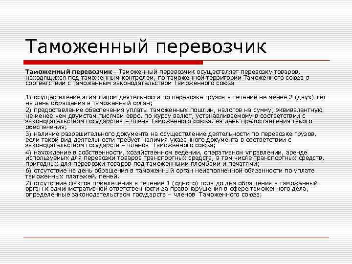 Таможенный перевозчик - Таможенный перевозчик осуществляет перевозку товаров, находящихся под таможенным контролем, по таможенной территории Таможенного союза в соответствии с таможенным законодательством Таможенного союза 1) осуществление этим лицом деятельности по перевозке грузов в течение не менее 2 (двух) лет на день обращения в таможенный орган; 2) предоставление обеспечения уплаты таможенных пошлин, налогов на сумму, эквивалентную не менее чем двумстам тысячам евро, по курсу валют, устанавливаемому в соответствии с законодательством государства – члена Таможенного союза, на день предоставления такого обеспечения; 3) наличие разрешительного документа на осуществление деятельности по перевозке грузов, если такой вид деятельности требует наличия указанного документа в соответствии с законодательством государств – членов Таможенного союза; 4) нахождение в собственности, хозяйственном ведении, оперативном управлении, аренде используемых для перевозки товаров транспортных средств, в том числе транспортных средств, пригодных для перевозки товаров под таможенными пломбами и печатями; 6) отсутствие на день обращения в таможенный орган неисполненной обязанности по уплате таможенных платежей, пеней; 7) отсутствие фактов привлечения в течение 1 (одного) года до дня обращения в таможенный орган к административной ответственности за правонарушения в сфере таможенного дела, определенные законодательством государств – членов Таможенного союза;