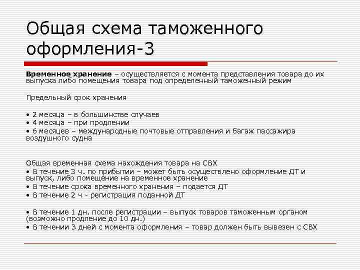 Общая схема таможенного оформления-3 Временное хранение – осуществляется с момента представления товара до их выпуска либо помещения товара под определенный таможенный режим Предельный срок хранения • 2 месяца – в большинстве случаев • 4 месяца – при продлении • 6 месяцев – международные почтовые отправления и багаж пассажира воздушного судна Общая временная схема нахождения товара на СВХ • В течение 3 ч. по прибытии – может быть осуществлено оформление ДТ и выпуск, либо помещение на временное хранение • В течение срока временного хранения – подается ДТ • В течение 2 ч - регистрация поданной ДТ • В течение 1 дн. после регистрации – выпуск товаров таможенным органом (возможно продление до 10 дн. ) • В течении 3 дней с момента оформления – товар должен быть вывезен с СВХ
