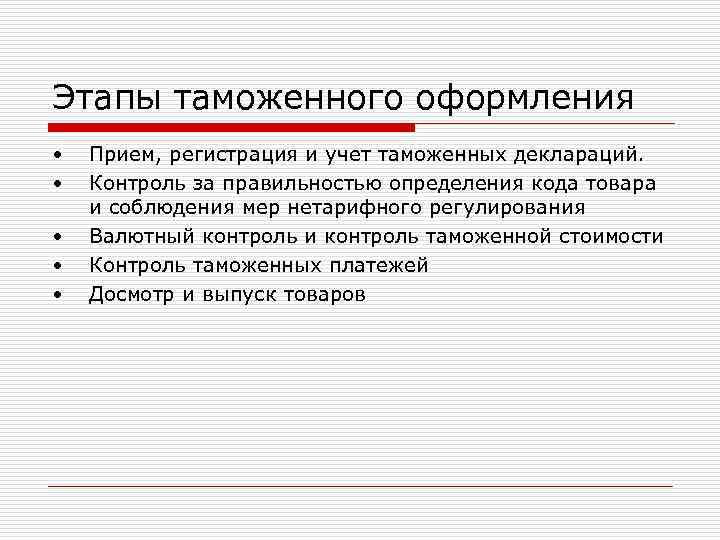 Этапы таможенного оформления • Прием, регистрация и учет таможенных деклараций. • Контроль за правильностью определения кода товара и соблюдения мер нетарифного регулирования • Валютный контроль и контроль таможенной стоимости • Контроль таможенных платежей • Досмотр и выпуск товаров