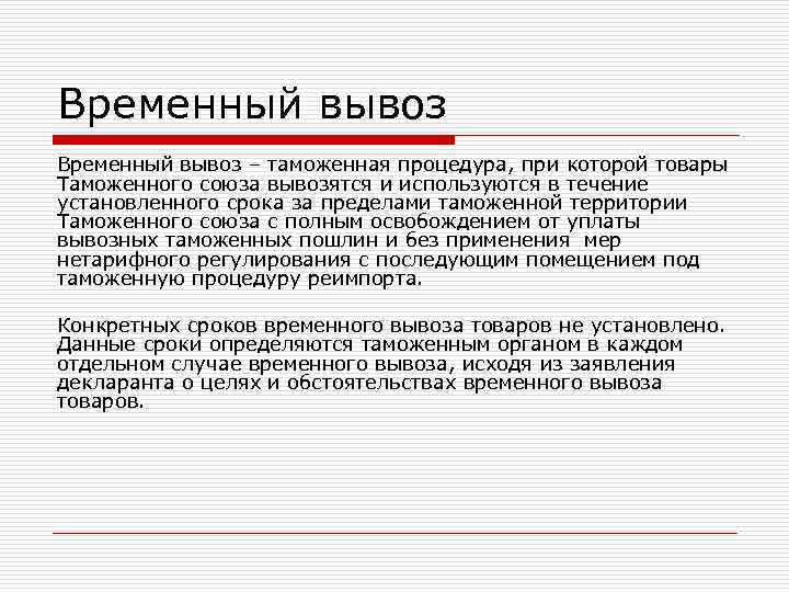 Временный вывоз – таможенная процедура, при которой товары Таможенного союза вывозятся и используются в течение установленного срока за пределами таможенной территории Таможенного союза с полным освобождением от уплаты вывозных таможенных пошлин и без применения мер нетарифного регулирования с последующим помещением под таможенную процедуру реимпорта. Конкретных сроков временного вывоза товаров не установлено. Данные сроки определяются таможенным органом в каждом отдельном случае временного вывоза, исходя из заявления декларанта о целях и обстоятельствах временного вывоза товаров.