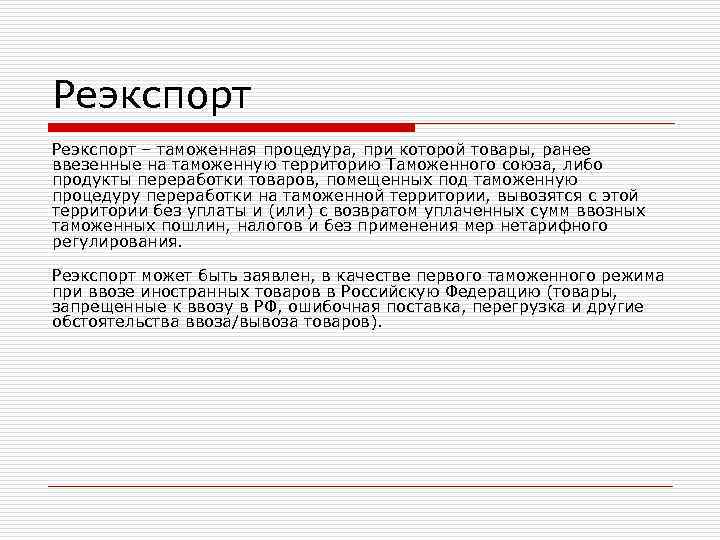 Реэкспорт – таможенная процедура, при которой товары, ранее ввезенные на таможенную территорию Таможенного союза, либо продукты переработки товаров, помещенных под таможенную процедуру переработки на таможенной территории, вывозятся с этой территории без уплаты и (или) с возвратом уплаченных сумм ввозных таможенных пошлин, налогов и без применения мер нетарифного регулирования. Реэкспорт может быть заявлен, в качестве первого таможенного режима при ввозе иностранных товаров в Российскую Федерацию (товары, запрещенные к ввозу в РФ, ошибочная поставка, перегрузка и другие обстоятельства ввоза/вывоза товаров).