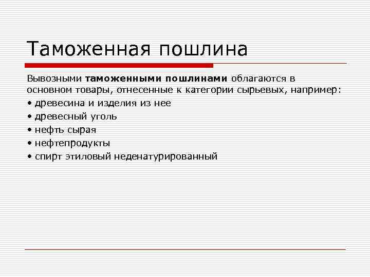 Таможенная пошлина Вывозными таможенными пошлинами облагаются в основном товары, отнесенные к категории сырьевых, например: • древесина и изделия из нее • древесный уголь • нефть сырая • нефтепродукты • спирт этиловый неденатурированный