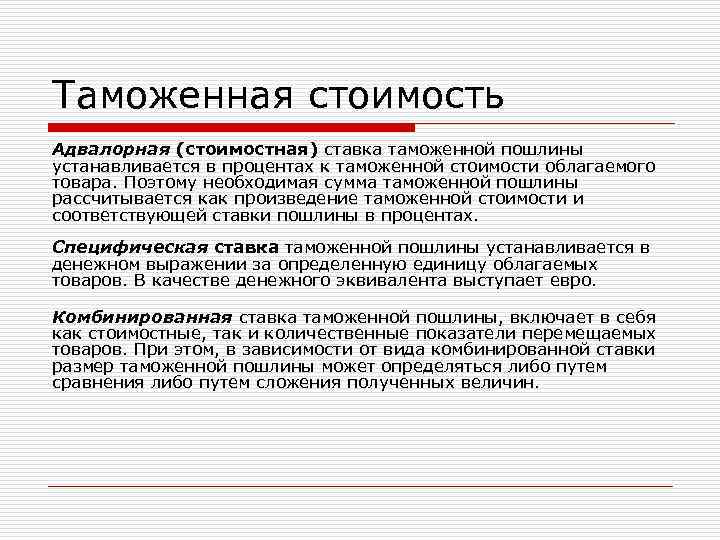 Таможенная стоимость Адвалорная (стоимостная) ставка таможенной пошлины устанавливается в процентах к таможенной стоимости облагаемого товара. Поэтому необходимая сумма таможенной пошлины рассчитывается как произведение таможенной стоимости и соответствующей ставки пошлины в процентах. Специфическая ставка таможенной пошлины устанавливается в денежном выражении за определенную единицу облагаемых товаров. В качестве денежного эквивалента выступает евро. Комбинированная ставка таможенной пошлины, включает в себя как стоимостные, так и количественные показатели перемещаемых товаров. При этом, в зависимости от вида комбинированной ставки размер таможенной пошлины может определяться либо путем сравнения либо путем сложения полученных величин.