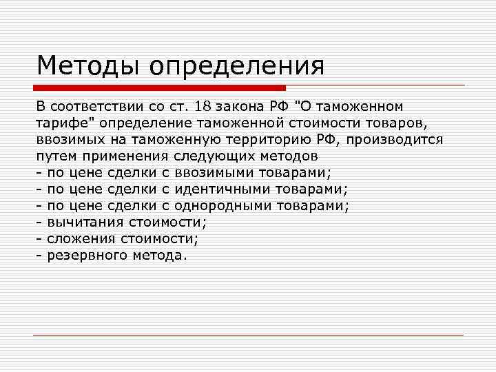 Методы определения В соответствии со ст. 18 закона РФ "О таможенном тарифе" определение таможенной стоимости товаров, ввозимых на таможенную территорию РФ, производится путем применения следующих методов - по цене сделки с ввозимыми товарами; - по цене сделки с идентичными товарами; - по цене сделки с однородными товарами; - вычитания стоимости; - сложения стоимости; - резервного метода.