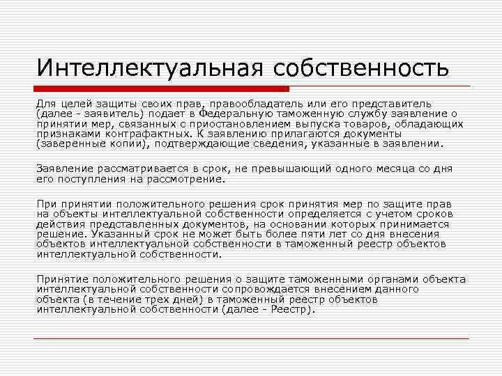 Интеллектуальная собственность Для целей защиты своих прав, правообладатель или его представитель (далее - заявитель) подает в Федеральную таможенную службу заявление о принятии мер, связанных с приостановлением выпуска товаров, обладающих признаками контрафактных. К заявлению прилагаются документы (заверенные копии), подтверждающие сведения, указанные в заявлении. Заявление рассматривается в срок, не превышающий одного месяца со дня его поступления на рассмотрение. При принятии положительного решения срок принятия мер по защите прав на объекты интеллектуальной собственности определяется с учетом сроков действия представленных документов, на основании которых принимается решение. Указанный срок не может быть более пяти лет со дня внесения объектов интеллектуальной собственности в таможенный реестр объектов интеллектуальной собственности. Принятие положительного решения о защите таможенными органами объекта интеллектуальной собственности сопровождается внесением данного объекта (в течение трех дней) в таможенный реестр объектов интеллектуальной собственности (далее - Реестр).