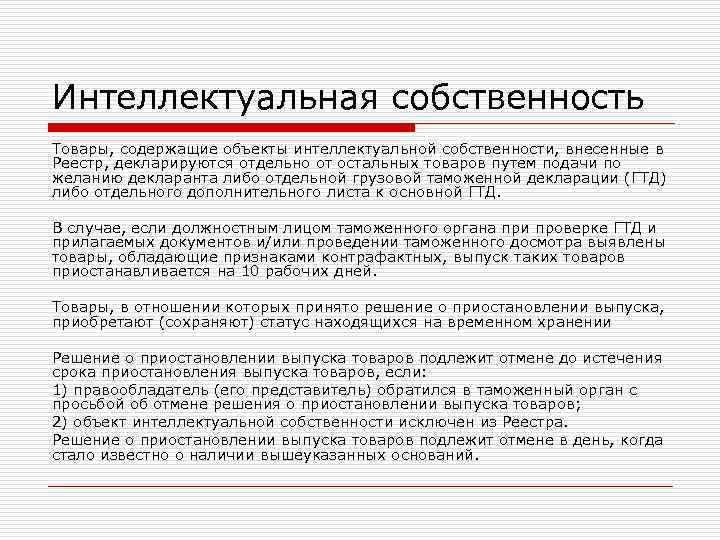 Интеллектуальная собственность Товары, содержащие объекты интеллектуальной собственности, внесенные в Реестр, декларируются отдельно от остальных товаров путем подачи по желанию декларанта либо отдельной грузовой таможенной декларации (ГТД) либо отдельного дополнительного листа к основной ГТД. В случае, если должностным лицом таможенного органа при проверке ГТД и прилагаемых документов и/или проведении таможенного досмотра выявлены товары, обладающие признаками контрафактных, выпуск таких товаров приостанавливается на 10 рабочих дней. Товары, в отношении которых принято решение о приостановлении выпуска, приобретают (сохраняют) статус находящихся на временном хранении Решение о приостановлении выпуска товаров подлежит отмене до истечения срока приостановления выпуска товаров, если: 1) правообладатель (его представитель) обратился в таможенный орган с просьбой об отмене решения о приостановлении выпуска товаров; 2) объект интеллектуальной собственности исключен из Реестра. Решение о приостановлении выпуска товаров подлежит отмене в день, когда стало известно о наличии вышеуказанных оснований.