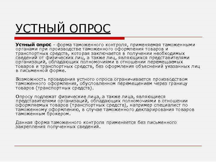 УСТНЫЙ ОПРОС Устный опрос - форма таможенного контроля, применяемая таможенными органами производстве таможенного оформления товаров и транспортных средств, которая заключается в получении необходимых сведений от физических лиц, а также лиц, являющихся представителями организаций, обладающих полномочиями в отношении перемещаемых товаров и транспортных средств, без оформления объяснений указанных лиц в письменной форме. Возможность проведения устного опроса ограничивается производством таможенного оформления, обусловленном перемещением через границу товаров (транспортных средств). Опросу подлежат физические лица, а также лица, являющиеся представителями организаций, обладающих полномочиями в отношении оформляемых товаров (транспортных средств), например специалист по таможенному оформлению, в случае таможенного декларирования товаров таможенным брокером. Данная форма таможенного контроля применяется без письменного закрепления полученных сведений.