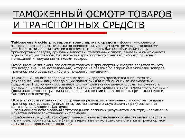 ТАМОЖЕННЫЙ ОСМОТР ТОВАРОВ И ТРАНСПОРТНЫХ СРЕДСТВ Таможенный осмотр товаров и транспортных средств - форма таможенного контроля, которая заключается во внешнем визуальном осмотре уполномоченными должностными лицами таможенного органа товаров, багажа физических лиц, транспортных средств, грузовых емкостей, таможенных пломб, печатей и иных средств идентификации товаров, без вскрытия транспортного средства либо его грузовых помещений и нарушения упаковки товаров. Особенностью таможенного осмотра товаров и транспортных средств является то, что это всегда внешнее исследование, которое не связано со вскрытием упаковки товаров, транспортного средства либо его грузового помещения. Таможенный осмотр товаров и транспортных средств проводится в присутствии декларанта, иных лиц, обладающих полномочиями в отношении осматриваемых предметов. Исключения составляют случаи применения данной формы таможенного контроля при нахождении товаров и транспортных средств в зоне таможенного контроля (если заинтересованные лица не изъявили желание присутствовать при производстве таможенного осмотра). Обязательность письменного оформления результатов таможенного осмотра товаров и транспортных средств (в виде акта, составляемого в двух экземплярах) зависит от одного из следующих факторов: - дальнейшего использования таможенными органами результатов осмотра, например, в качестве доказательственной информации - требования лица, обладающего полномочиями в отношении осматриваемых товаров и (или) транспортных средств (как альтернатива акту, возможна отметка в транспортном документе о проведении осмотра).