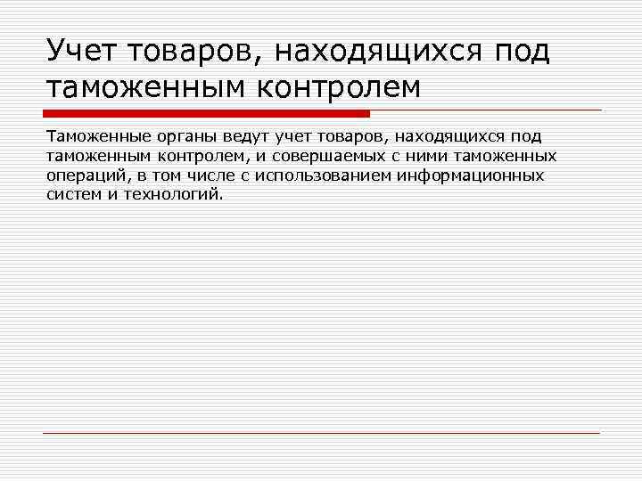 Учет товаров, находящихся под таможенным контролем Таможенные органы ведут учет товаров, находящихся под таможенным контролем, и совершаемых с ними таможенных операций, в том числе с использованием информационных систем и технологий.
