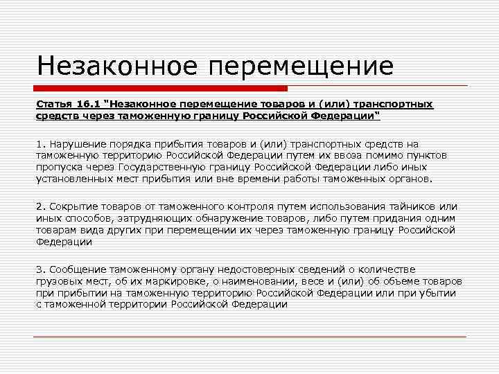 Незаконное перемещение Статья 16. 1 "Незаконное перемещение товаров и (или) транспортных средств через таможенную границу Российской Федерации" 1. Нарушение порядка прибытия товаров и (или) транспортных средств на таможенную территорию Российской Федерации путем их ввоза помимо пунктов пропуска через Государственную границу Российской Федерации либо иных установленных мест прибытия или вне времени работы таможенных органов. 2. Сокрытие товаров от таможенного контроля путем использования тайников или иных способов, затрудняющих обнаружение товаров, либо путем придания одним товарам вида других при перемещении их через таможенную границу Российской Федерации 3. Сообщение таможенному органу недостоверных сведений о количестве грузовых мест, об их маркировке, о наименовании, весе и (или) об объеме товаров прибытии на таможенную территорию Российской Федерации или при убытии с таможенной территории Российской Федерации