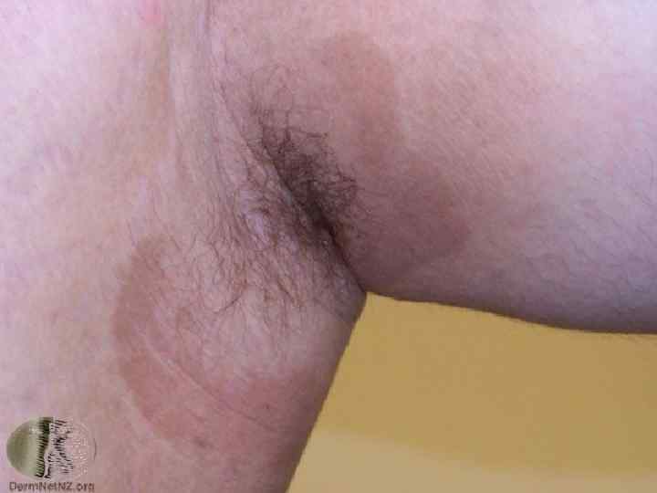 Эритразма Возбудителем заболевания является Corynebaclerium minutissimum. Коринебактерии находятся только в роговом слое эпидермиса. В патогенезе заболевания имеют значение индивидуальные особенности организма, повышенное потоотделение, влажность и высокая температура воздуха, изменение р. Н кожи в щелочную сторону, мацерация, трение. Очаги эритразмы представляют собой четко очерченные пятна округлой формы буровато красного или коричневого цвета с легким едва заметным шелушением. Эритразма часто располагается в бедренно мошоночных и подмышечных складках и реже в межъягодичной, в межпальцевых пространствах стоп или под молочными железами. Диагностика основана на клинической симптоматике и характерной локализации. Подтверждается микроскопическим исследованием. В лучах лампы Вуда коралловокрасный свет. Дифференциальная диагностика При паховой эпидермофитии наблюдаются валикообразные края, бордюр интернрованного эпидермиса по периферии очагов, пузырьки, воспалительные явления, зуд. От рубромикоза с локализацией в пахово бедерных складках эритразму отличает наличие сплошного края очага, тогда как при рубромикозе имеются прерывистый воспалительный валик очагов, как правило, поражение кожи стоп и ногтей, а также различной степени интенсивности зуд. От разноцветного лишая эритразма отличается локализацией и цветом очагов, а также характером свечения под люминесцентной лампой. При опрелости выражены островоспалительные явления и очертания очагов. Лечение: Спиртовые растворы анилиновых красителей, антибактериальные мази.
