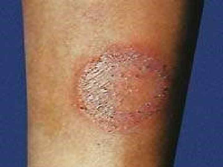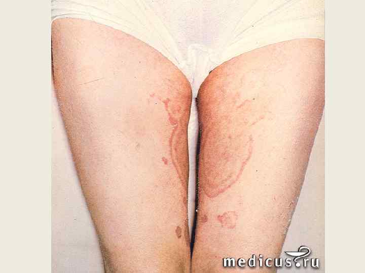Эпидермофития паховая • Микоз, обусловлен Epidermophyton floccosum (inguinale). • Локализуясь в больших складках, гриб поражает чаще паховую область, может переходить на соприкасающиеся внутренние поверхности бедер, мошонку, межъягодичную и лобковую область. • Процесс обычно протекает с выраженными воспалительными явлениями, зудом. • Эритематозные очаги увеличиваются за счет периферического роста и слияния, приобретают фигурные очертания, центральная их часть постепенно бледнеет. • В периферической зоне имеется валик, состоящий из свежих и подсохших пузырьков или нежного бордюра из отслаивающегося эпидермиса. • Особенности локализации процесса приводят к потертостям и выраженной мацерации в складках. • Свечение в лучах лампы Вуда отсутствует • Лечение – антисептики, противогрибковые мази.