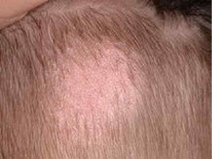 Микроспория Инфицирование происходит при прямом контакте детей с животными или с больным ребенком, а также через предметы, загрязненные грибами. Заболевание имеет две клинические разновидности: поверхностную (поражение гладкой кожи и волос) и инфильтративнонагноительную, Клиника На волосистой части головы заболевание отличается большим количеством очагов (1— 2 больших и множество мелких). • Отмечается сплошное обламывание волос на уровне 6— 8 мм. На обломках отчетливо контурируются скопления спор в виде чехликов, футляров или муфт. • Нагноительная глубокая микроспория (типа kerion) нередко сопровождается лихорадочным состоянием, недомоганием, увеличением регионарных лимфатических узлов. Поражение гладкой кожи имеет вид единичных эритематозно сквамозных очагов правильно округлых или овальных очертаний с четкими границами и валикообразно приподнятыми краями, на которых располагаются папуловезикулы, пустулы, серозно гнойные корки, чешуйки. Диагностика • По клинической симптоматике, микроскопии и по зеленой флюоресценции спор гриба в пораженных волосах под лучами лампы Вуда. При дифференцировании от трихофитии и фавуса обращают внимание на • высоко обломанные волосы, • наличие муфтообразных чехликов на них, • характерное асбестовидное шелушение, • результаты микроскопического, культурального и люминесцентного анализа.