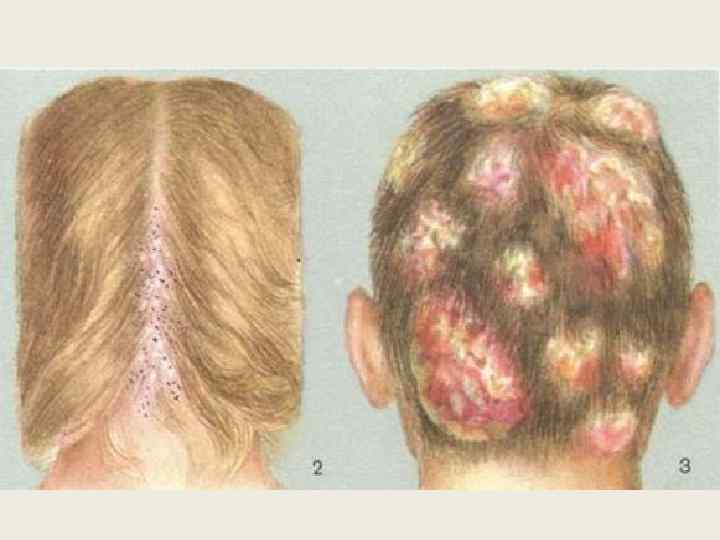 Хроническая трихофития. Возникает в детском возрасте. Этому способствует нерациональное лечение, вегетодистонии, иммунных нарушений, эндокринопатии. У мальчиков к половозрелому возрасту наступает спонтанное излечение. Инфильтративно-нагноительная трихофития волосистой части головы отличается глубоким бурным воспалением с образованием единичных инфильтративных узлов с застойно синюшной насыщенно гиперемированной кожей. В центральной части глубоких абсцессов с разрушенными фолликулами при легком сжатии из пораженных фолликулов выделяется гной. Внешне это напоминает выделение меда из сот, поэтому древнеримский врач Цельс называл это заболевание «kerion» (медовые соты). Вместе с гноем удаляются и волосы. Поэтому на месте поражения образуются втянутые атрофические рубцы, нередко спаянные с апоневрозом. Диагноз Распознавание поверхностной и инфильтративно нагноительной трихофитии несложно, так как она имеет характерные клинические симптомы. Для поверхностной трихофитии основными симптомами являются: низко обломанные волосы, большое число сохранившихся здоровых волос, склонность очагов к слиянию. Обнаружение спор гриба внутри волоса при микроскопическом исследовании подтверждает диагноз.