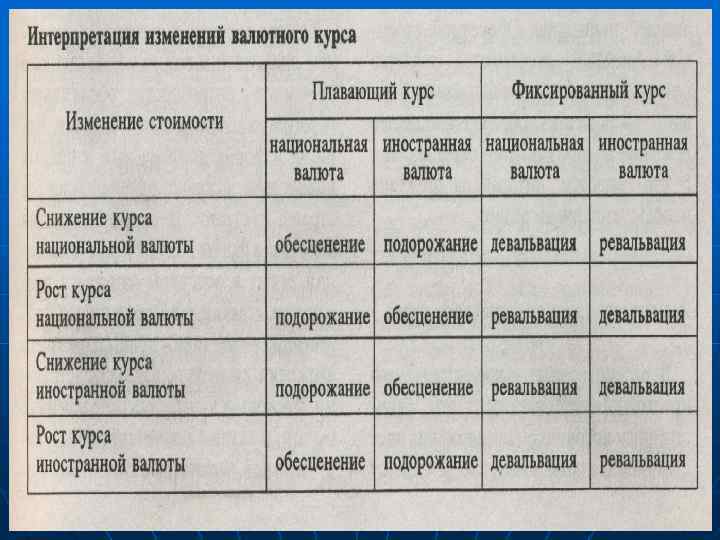 В рыночных условиях спрос и предложение иностранной валюты постоянно изменяются под влиянием массы факторов. Соответственно изменяется и валютный курс национальной валюты. Обесценение валюты – снижение стоимости валюты при режиме плавающего валютного курса. Подорожание валюты – увеличение стоимости валюты при ре режиме плавающего валютного курса.