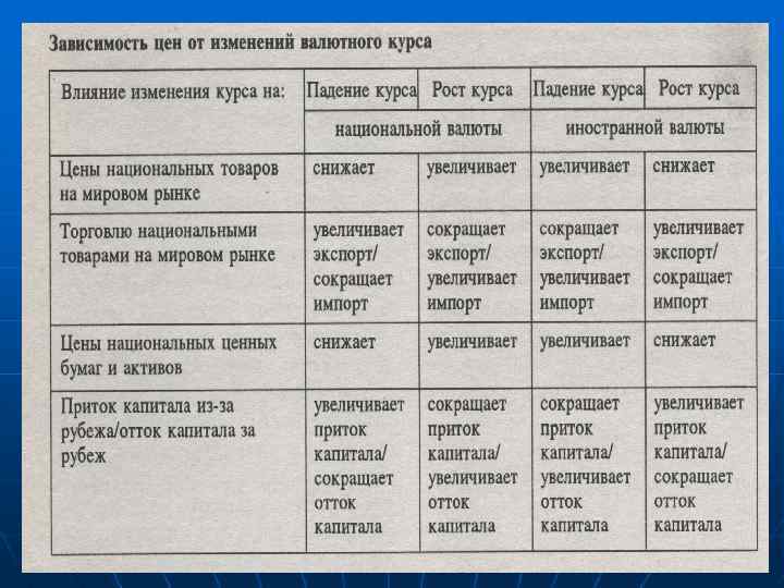 Падение курса национальной валюты приводит к снижению цен национальных товаров на мировом рынке, выраженных в иностранной валюте, что способствует росту экспорта, который в результате становится более конкурентоспособ ным и н. о.