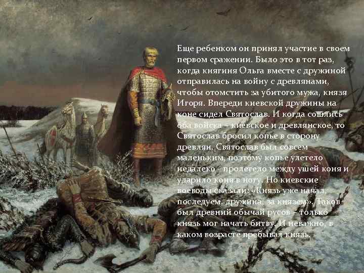 Еще ребенком он принял участие в своем первом сражении. Было это в тот раз, когда княгиня Ольга вместе с дружиной отправилась на войну с древлянами, чтобы отомстить за убитого мужа, князя Игоря. Впереди киевской дружины на коне сидел Святослав. И когда сошлись оба войска – киевское и древлянское, то Святослав бросил копье в сторону древлян. Святослав был совсем маленьким, поэтому копье улетело недалеко - пролетело между ушей коня и ударило коня в ногу. Но киевские воеводы сказали: «Князь уже начал, последуем, дружина, за князем» . Таков был древний обычай русов – только князь мог начать битву. И неважно, в каком возрасте пребывал князь.