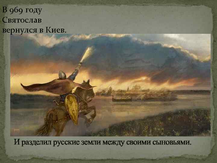 В 969 году Святослав вернулся в Киев. И разделил русские земли между своими сыновьями.