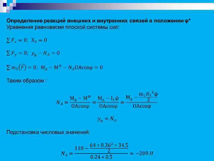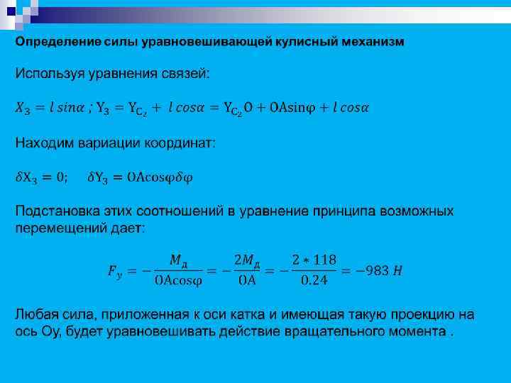 Цель нашей работы: n n n Определить скорость маховика при его повороте на угол φ=φ. Определить угловое ускорение маховика при его повороте на угол φ=φ. Найти силу, приводящую в движение кулису в положении механизма когда φ=φ и реакцию подшипника на оси маховика. Рассчитать силу, приложенную в центре катка и уравновешивающую механизм в положении, когда φ=φ. Записать дифференциальное уравнение движения механизма, используя уравнение Лагранжа второго рода и уравнение движения машины.