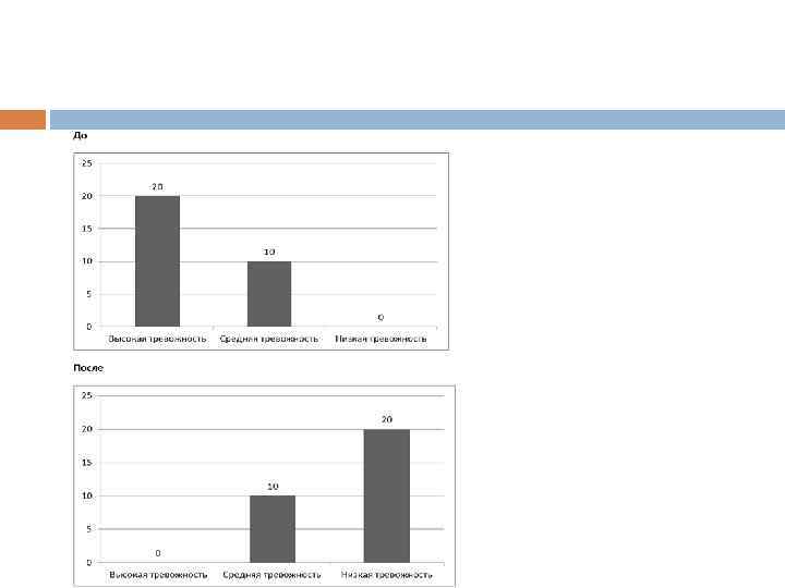 После проведения формирующего этапа исследования был проведен контрольный эксперимент, который выявил показатели, демонстрирующие положительную динамику. По итогам контрольного эксперимента и проведения всех коррекционных работ нам удалось достигнуть значительной коррекции уровня тревожности. С помощью IBM SPSS Statistics, нами были сравнены данные до и после формирующего эксперимента по Тест-Опроснику Реана по критерию Вилкоксона для связанных выборок. В результате на уровне значимости α=0, 05 нами сделан вывод, что выборки не однородны, следовательно существует влияние проведенных тренинговых занятий.