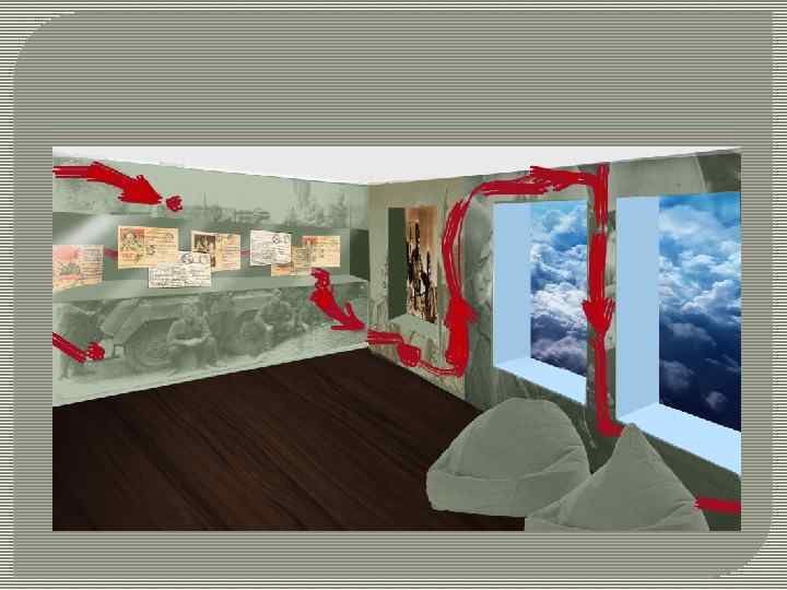 ТЕХНИЧЕСКОЕ ДИЗАЙН-ПРОЕКТИРОВАНИЕ Экспозиция состоит в основном из коллажей, в которых использованы фотографии документов из музея, и экспонатов, находящихся в витринах. Настенные коллажи будут сделаны при помощи широкоформатной печати на пластике. Планируется напечатать несколько плакатов, затем произвести накатку на пластик (5 мм. /100 см. х 150 см. ) и закрепить их на стене. Основными объектами хранения экспонатов будут выступать витрины с алюминиевым каркасом (профиль октагрант) и столешницей из оргстекла. В качестве сидений используются пуфы-мешки , выполненные из брезента. Потолок оформлен пластиковыми панелями с изображением неба и камуфляжной сеткой.