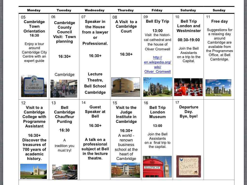 Специальные семинары и экскурсии • визит в муниципальный центр (County Council), например, отдел городского планирования; • семинар с квалифицированными правовыми советниками; • семинар по международному сотрудничеству, включающему историю основателя центра Франка Белла; • посещение судов в Кембридже; • посещение Judge Business School, одной из мировых лидирующих бизнес-школ в Кембридже.
