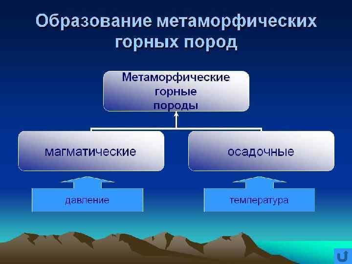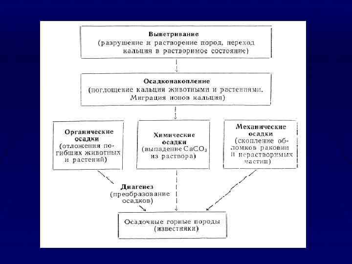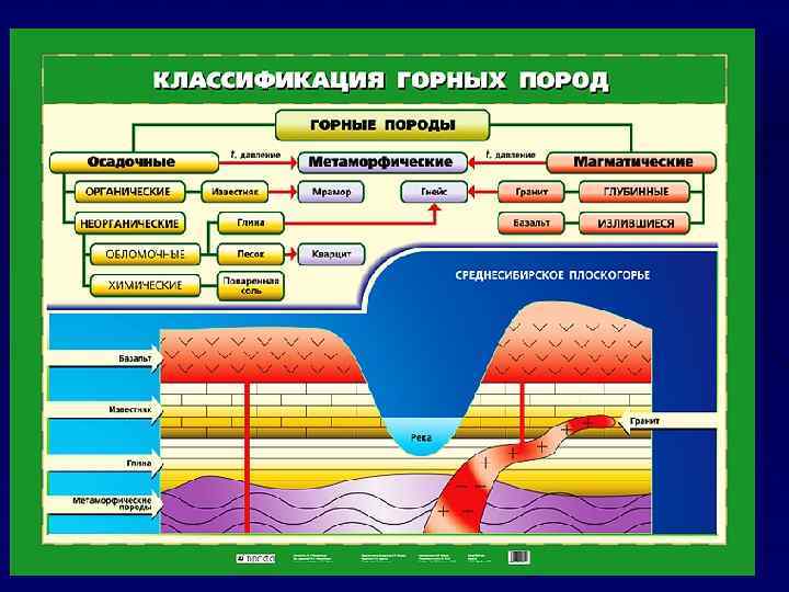 Генезис пород Магматические породы ( гранит, сиенит, дунит, габрро, базальт, диорит) по содержанию кремнезема подразделяются на - кислые (более 65%) гранит, липарит, кварцевый порфир - средние ( 52 -65%) диорит, андезит, сиенит, трахит - основные (40 -52%) габрро, базальт. - ультраосновные ( менее 40%) Перидотит, пироксенит, дунит Осадочные породы – породы возникшие путем отложения ( механического, химического или органического) из воды или воздуха продуктов разрушения магматических или метаморфических пород ( известняки, песчаники, ископаемые угли, осадочные железистые руды ). Метаморфические породы – породы, возникшие в результате преобразования магматических или осадочных пород под воздействием высоких давлений, температур и горячих газовых растворов ) кварцит, кристаллические сланцы, гнейсы, мрамор).