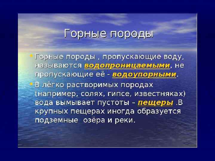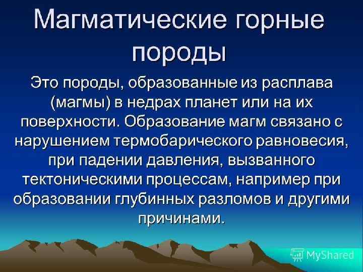 Горные породы § Горная порода- природное образование, агрегат минералов § § § более или менее однородного состава, слагающий самостоятельное геологическое тело. Если минерал- химическое соединение элементов, то порода- механическое соединение минералов. Горная порода может состоять из кристаллических, аморфных , жидких и газообразных материалов. Свойства горных пород зависят от их минерального состава и структурно-текстурных признаков. Содержание в породе различных минералов, выраженное в процеснтах, называется количественным минеральным составом и является одним из основных определяющих ее признаков.