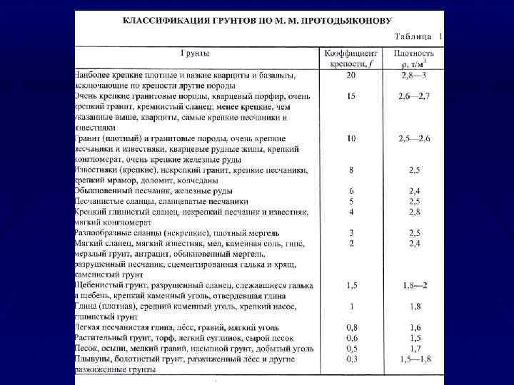 Классификация горных пород по коэффициенту крепости f = R/10 (прочность образца горной породы на одноосное сжатие R в МПа) в первом приближении. Все породы разделены на 10 категорий. I и II категории - породы высшей крепости с f >15. Кварциты, базальты. III и IV категории – крепкие породы с f = 8 -15. Граниты, песчаники. V категория – породы средней крепости с f =3 -8. Крепкие глинистые сланцы, некрепкие известняки и песчаники, конгломераты. VI и VII категории – мягкие породы с f = 0. 8 -2. Уголь, глины, соли, мягкие сланцы. VIII – Х категории – землистые, сыпучие и плывучие грунты с f = 0. 3 -0. 6. Торф, лесс.