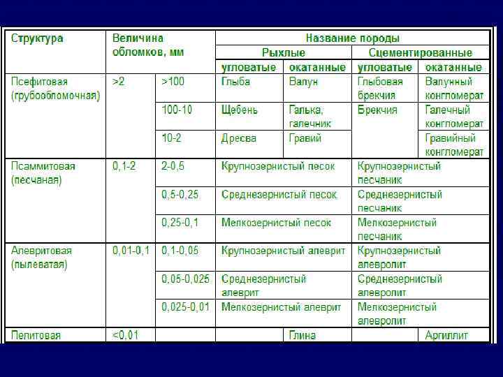 Классификации горных пород по текстуре и структуре Структура - степень кристаллизации пород, размеры и форма минеральных зерен и характер связей между ними. По степени кристаллизации – полнокристаллические, неполнокристаллические, стекловатые, порфировые, обломочные. По размерам минеральных зерен – от гигантозернистых (слюдяные пегматиты с размерами зерен свыше 100 мм) до мелкозернистых с размерами зерен до 1 мм (углевмещающие породы – песчаники, алевролиты, аргиллиты). Характер структурных связей между минеральными связями (прежде всего состав цементирующего вещества) – кремнистый, железистый, известковистый, глинистый в порядке убывания прочностных свойств. Текстура – взаимное расположение структурно-однотипных частей породы. Текстура упорядоченная (формирует анизотропию прочностных свойств) и неупорядоченная – породы квазиизотропные (почти изотропные) с показателями механических свойств, не зависящими от направления силового воздействия. Массивная, пористая