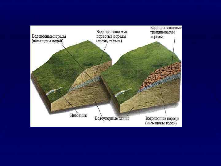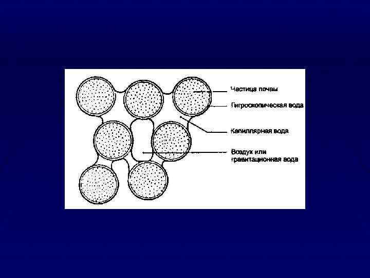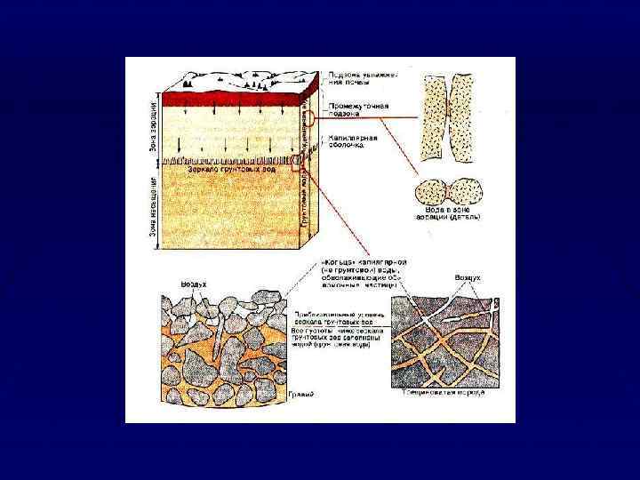 Свободная вода в породах может находиться в виде капиллярной воды, удерживаемой в мелких порах силами капиллярного поднятия, и в виде гравитационной воды, заполняющей крупные поры и передвигающейся в породах под действием сил тяжести или напора. Количество капиллярной воды оценивается величиной капиллярной влагоемкости, которая зависит от среднего размера поровых каналов, перпендикулярных зеркалу грунтовых вод в изучаемом объеме. В зависимости от минерального и гранулометрического состава пород и формы частиц соотношение количества видов воды в породах различно. Так, пески содержат в основном гравитационную воду, а глины, лёсс и суглинки — молекулярную и капиллярную. Относительное содержание капиллярной воды в глинах составляет 18— 50%.