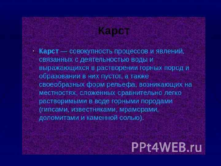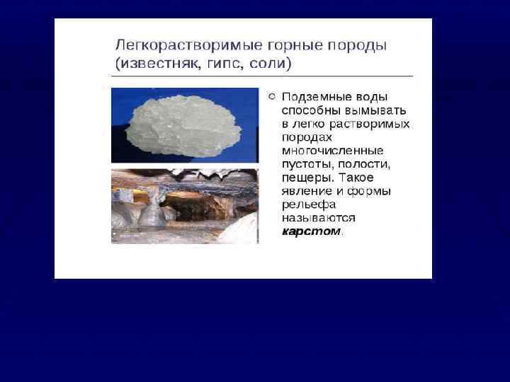 К вторичным порам относятся: 1. Поры растворения, образовавшиеся в результате циркуляции подземных вод. За счет растворения минеральной составляющей породы активными флюидами (циркуляционными водами) образуются поры. В карбонатных породах в результате процессов карстообразования образуются поры в ыщелачивания, вплоть до образования карста. 2. Поры и трещины, возникшие под влиянием химических процессов, приводящие к сокращению объёма породы. Например, превращение известняка (Са. СО 3) в доломит (Са. СО 3· Мg. СО 3). При доломитизации идет сокращение объёмов породы приблизительно на 12 %, что приводит к увеличению объёма пор. Аналогично протекает и процесс каолинизации – образование каолинита (Al 2 O 3·2 • Si. O 2·H 2 O). 3. Пустоты и трещины, образованные за счёт эрозионных процессов: выветривания, кристаллизации, перекристаллизации. 4. Пустоты и трещины, образованные за счёт тектонических процессов, напряжений в земной коре.