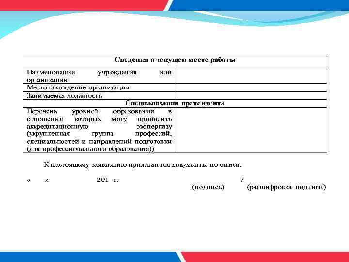 Комплект документов, прилагаемых к заявлению: К заявлению об установлении полномочий физического лица в качестве эксперта прилагаются следующие документы: а) копия документа, удостоверяющего личность; б) копии документов, подтверждающих соответствие полученного образования и стажа работы (документов об образовании и о квалификации, трудовой книжки, трудовых договоров, договоров о выполнении претендентом работ (услуг) по заявленным видам деятельности за последние 3 года); в) рекомендация от руководителя организации по последнему месту основной работы претендента в сфере образования; г) опись представленных документов. Копии документов (выписки), не заверенные в установленном порядке, представляются с предъявлением оригиналов документов