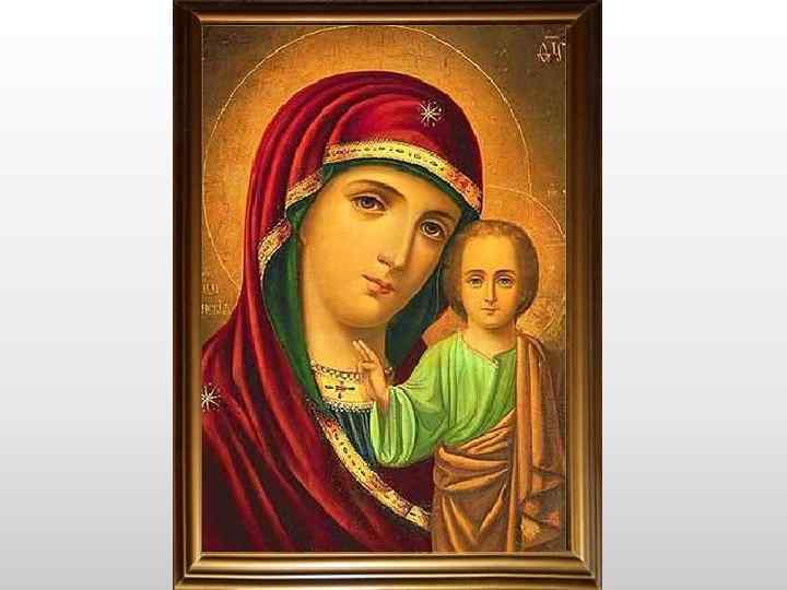 История Иконографический тип - Одигитрия (Путеводительница — один из наиболее распространённых типов изображения Богоматери с младенцем Иисусом); 21 июля – день иконы Божией Матери «Казанская» ; Первое чудесное явление иконы произошло в Казани в 16 веке (1579); Богородица приходит во сне к маленькой девочке Матроне и рассказывает, что под обломками сгоревшего дома, где жила семья девочки, находится Её образ.
