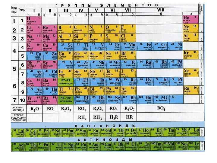 7. 1. 4. Периодическая система элементов Д. И. Менделеева. Принцип Паули позволяет объяснить периодичность свойств атомов и принцип построения периодической системы элементов, составленной задолго до создания квантовой механики в 1869 году русским учёным Дмитрием Ивановичем Менделеевым. Периодическая система элементов является фундаментальным законом природы, на котором базируются современная химия, атомная и ядерная физика. Менделеев расположил известные в то время 64 химических элемента в порядке возрастания их атомных масс. Периодически через правильные промежутки - периоды элементы, оказавшиеся в таблице в одном вертикальном ряду - в группе, обнаруживают сходные физико-химические свойства. Но часть клеток оказалась незаполненной. В дальнейшем были открыты новые элементы, свойства некоторых из них были предсказаны Менделеевым. В настоящее время таблица полностью заполнена.