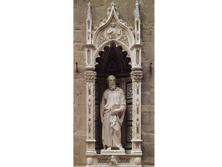В фигуре апостола Марка для флорентийской церкви Орсан-Микеле (10 -е годы XV в. ) он решает проблему постановки человеческой фигуры в рост по законам пластики, разработанным еще Поликлетом, но забытым в средневековье. Апостол стоит опираясь на правую ногу, левая отодвинута назад и согнута в колене, слегка поддерживая равновесие фигуры. Это движение подчеркнуто складками плаща, спадающими вдоль правой ноги, и сложным узором гибких линий этих складок, рассыпающихся по левой.