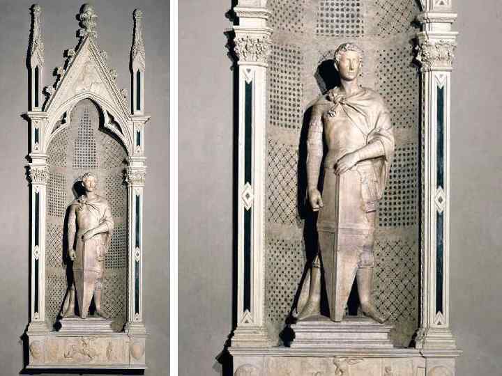 Для другой ниши того же здания по заказу цеха оружейников Донателло исполнил статую святого Георгия, воплощающую уже ясно выраженный идеал раннего Возрождения, чувство самосознания и уверенности в этом ярко индивидуальном образе подчеркнуто свободной, спокойной позой фигуры, напоминающей колонну, что сближает «Св. Георгия» с лучшими образцами греческой скульптуры периода высокой классики. Это «не очеловеченный бог античности, а обожествленный человек новой эпохи.