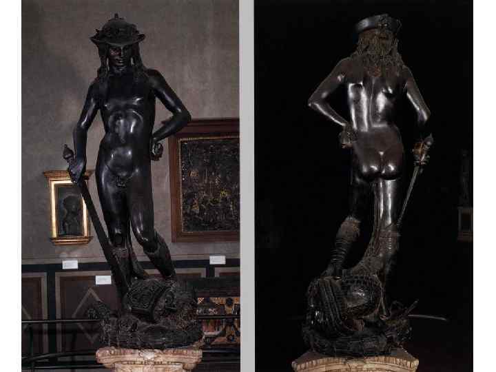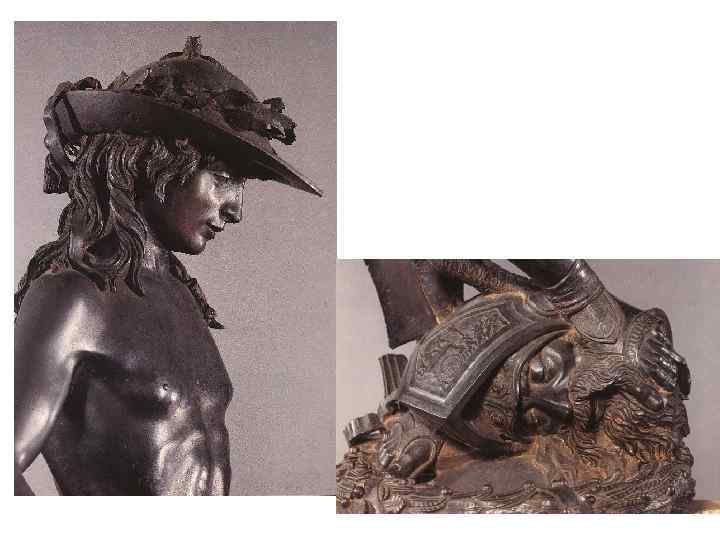В бронзовом «Давиде» (30 -е годы) Донателло вновь возвращается к античным традициям, но уже поздней греческой классики. Простой пастух, победитель гиганта Голиафа, спасший жителей Иудеи от ига филистимлян и ставший потом царем, Давид стал одним из излюбленных образов искусства Возрождения. Донателло изобразил его совсем юным, идеально прекрасным, как праксителевский Гермес. Но Донателло не побоялся ввести такую бытовую деталь, как пастушеская шляпа — знак его простого происхождения.