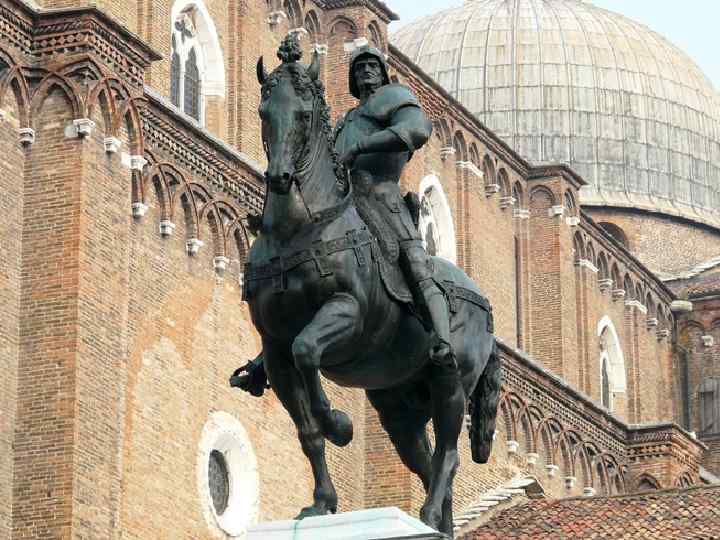 Сложен профиль высокого постамента, рассчитанного так, чтобы силуэт всадника четко читался на фоне неба, посреди маленькой площади, окруженной высокими домами. Черты изысканности у Вероккио соответствуют аристократизации вкусов, характерной для Флоренции конца XV в. , хотя благодаря таланту Вероккио в его памятнике есть и величавость, и цельность монументального образа. Кондотьер Вероккио — это обобщенный тип, характерный для той эпохи. Алессандро Леопарди отлил ск-ру.