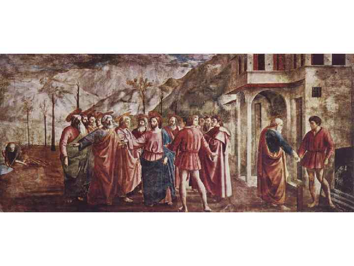 • В сцене «Подать» объединены сразу три сюжета: Христос с учениками у ворот города, остановленный сборщиком податей, — это центральная композиция; Петр, по велению Христа вылавливающий рыбу, чтобы достать из нее необходимую для уплаты монету (дидрахму, или статир, отсюда и другое название фрески — «Чудо со статиром» ), — композиция слева; сцена выплаты подати сборщику — справа. Сам принцип соединения на одной плоскости трех сцен еще архаичен, но эти сцены написаны с учетом линейной и воздушной перспективы, —что явилось подлинным откровением и для современников. Мазаччо первый решил главные проблемы Кватроченто —линейной и воздушной перспективы.