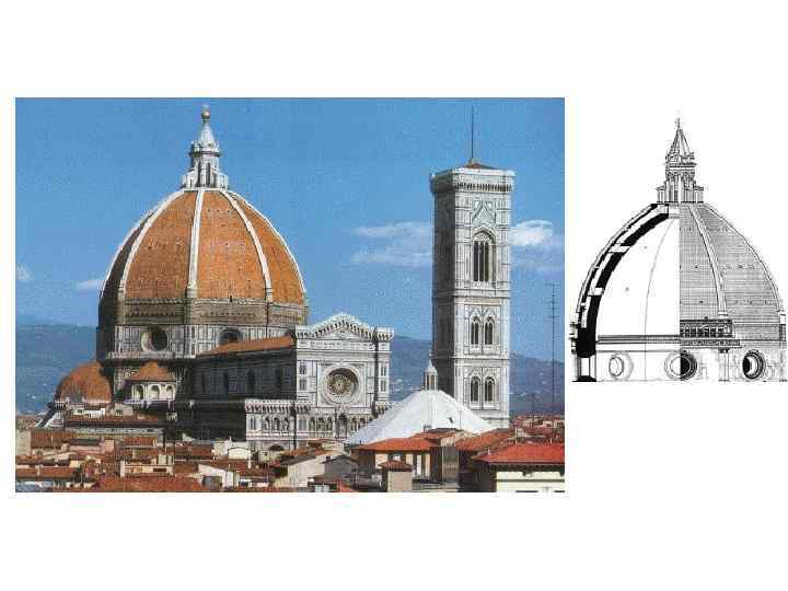 • Флорентийская школа XV в. Первую роль в Кватроченто выпало сыграть Флоренции. С XII в. уже богатый город-коммуна, оставивший свой след в искусстве Треченто скульптурами семейства Гизано и гением Данте и Джотто. • Флоренция становится главным центром ренессансной культуры в эпоху Кватроченто. С 1434 г. власть во Флоренции переходит к Козимо Медичи, основателю банкирской династии герцогов -меценатов • В архитектуре Италии только в XV в. начинают проявляться черты нового стиля. Филиппе Брунеллески (1377— 1446) завершил в 1434 г. гигантским куполом Флорентийский собор, в общем готическое здание, заложенное еще в 1295 г. Арнольфо ди Камбио