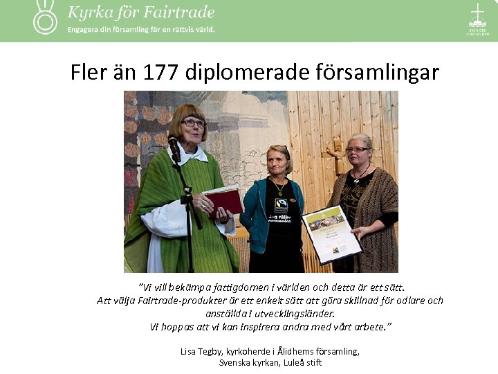 Fler än 177 diplomerade församlingar ”Vi vill bekämpa fattigdomen i världen och detta är ett sätt. Att välja Fairtrade-produkter är ett enkelt sätt att göra skillnad för odlare och anställda i utvecklingsländer. Vi hoppas att vi kan inspirera andra med vårt arbete. ” Lisa Tegby, kyrkoherde i Ålidhems församling, Svenska kyrkan, Luleå stift