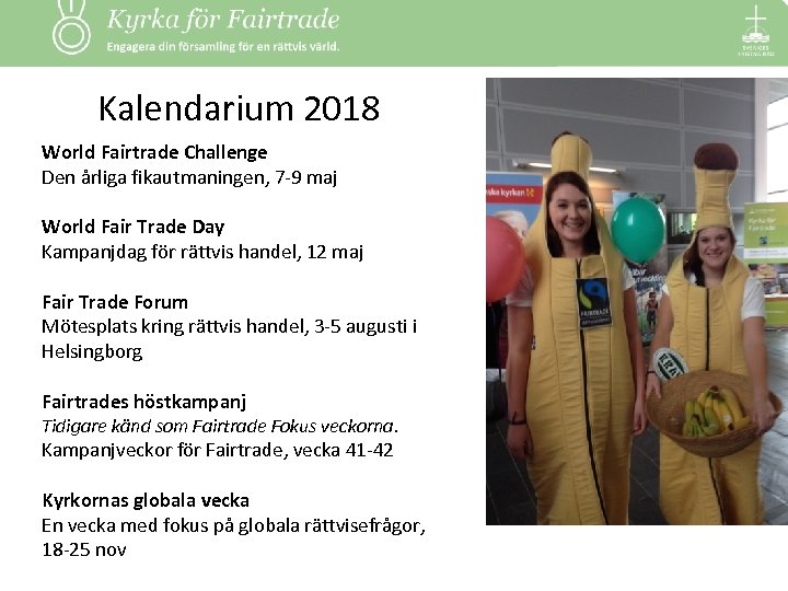 Kalendarium 2018 World Fairtrade Challenge Den årliga fikautmaningen, 7 -9 maj World Fair Trade Day Kampanjdag för rättvis handel, 12 maj Fair Trade Forum Mötesplats kring rättvis handel, 3 -5 augusti i Helsingborg Fairtrades höstkampanj Tidigare känd som Fairtrade Fokus veckorna. Kampanjveckor för Fairtrade, vecka 41 -42 Kyrkornas globala vecka En vecka med fokus på globala rättvisefrågor, 18 -25 nov