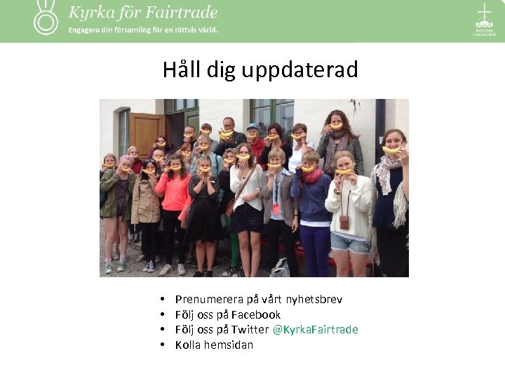 Håll dig uppdaterad • • Prenumerera på vårt nyhetsbrev Följ oss på Facebook Följ oss på Twitter @Kyrka. Fairtrade Kolla hemsidan